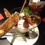 Par gourmandise, nous nous laissons tenter par un dessert à la banane, glace à la fraise, et flanc à la vanille. Moyen.