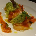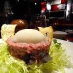 Fred prend un tartare comme entrée, et Audrey en prend deux: St Jacques mangue avocat, avec un peu de coriandre fraiche, et des boulettes de boeuf wafyu aux champignons. Les St Jacques sont bonnes, crues, l'association avec l'assaisonement cohérente, même si il couvre un peu trop le goût subtil de la noix. Les boulettes ne sont pas terribles, dans le sens où la sauce ne rend pas hommage à la noblesse de la viande. Le tartare de Fred, coupé au couteau, est bon. L'oeuf posé dessus éclate et coule quand il l'ouvre, et le tartare est parfumé à la truffe. Une réussite.