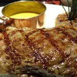 Le plat est un boeuf Prime Angus 250g, le top de la viande américaine, à la cuisson "rare" (c'est à dire saignant). La pièce est belle, la cuisson un poil trop cuite (Fred aurait préféré un peu plus saignant). Plusieurs choix de sauce sont disponibles. La béarnaise qu'il choisit n'est pas aussi bonne que celle que nous trouvons chez nous. La purée à la truffe qui accompagne la viande est un délice, et servie généreusement. Par contre, mauvais point, les assiettes ne sont pas chaudes.