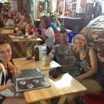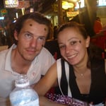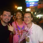 Il revient la chercher vers 22h30, attendu en bas de l'hôtel par cinq autres européens rencontrés là-bas. Nous voilà donc partis tous les sept en ville, à deux tuk-tuks, pour aller manger un morceau et boire des verres sur Kao San Road. La rue est plus qu'agitée, chaque bar diffuse sa propre musique, et les vendeurs ambulants, comme cette petite fille qui joue avec nous, une fois posés, à pierre-papier-ciseau pour nous vendre une rose, sont légions. Nous perdons en route les trois polonais, et la chance veut que nous les retrouvions au bon moment pour pousuivre la soirée dans un bar tenu par un japonais, où nous mettons l'ambiance, avec une table voisine (de thaïlandais), puis les autres, à faire notamment des concours de bras de fer, avec Fred comme juge et animateur, poussé par son nouvel ami allemand d'un mètre quatre-vingt dix, pesant presque deux fois son poids, et un peu éméché après les combats de boxe thaï et ce qui a suivi. Fred réussira même à le battre en fin de soirée. Tout cela se termine joyeusement vers deux heures du matin, alors que la rue est toujours aussi bondée. Une des soirées les plus amusantes que Fred ait passée depuis le début du voyage.