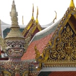 Décollage vers 12h30, direction Wat Prakaeo, qui abrite le boudha d'émeraude et le palais royal, en taxi. 1h plus tard - nous ne sommes pourtant pas si loin - ce dernier nous dépose au pied de l'enceinte blanche protégeant les différents bâtiments et temples. L'endroit est considéré comme le temple boudhiste le plus sacré de Thaïlande, et situé dans le centre historique de la ville (Phra Nakhon District). Le temple principal, construit en 1782, contient une statue de Boudha en jade ("Emerald" en Thaï fait référence à la couleur et non à la pierre précieuse...) représenté en position de méditation typique de l'école Lanna de la Thaïlande du nord. En dehors du roi, personne n'est autorisé à la toucher. C'est du coup sa Majesté qui, 3 fois par an, change la cape ornementale de celle-ci. Ce rituel important a lieu l'été, l'hiver et à la saison des pluies, pour porter bonne chance au pays pendant chacune de ces saisons. Bien que la légende trouve une trace de cette statue en Inde, les archives historiques datent sa découverte au Cambodge, au 15ième siècle, puis son transfert au Laos, puis au Vietnam, où elle serait restée 215 ans, pour finalement arriver en Thaïlande au 18ième. Elle est depuis profondément vénérée, et considérée comme la protectrice du pays.