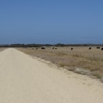 Vers midi, nous reprenons la route, et choisissons de prendre la Powell Road, celle la plus proche de la côte. C'est en fait une piste au milieu de champs jaunes et de boeufs en liberté. En fait, nous traversons le Little Dip Conservation Park que nous souhaitions faire juste avant, comprenant plusieurs lacs, dont le Lake Elizabeth, très grand, plutôt asséché, et dont la vue surprend au milieu de tout cela. Sur la piste, nous nous arrêtons pour prendre une photo, quand la voiture arrivant juste en face fait de même pour s'assurer que tout va bien, et que nous n'avons pas de problème. Il faut dire que nous ne croisons pas grand monde. Ils sont sympas ces australiens. Dans les prochains jours, Nous ferons du coup de même à plusieurs reprises en voyant des voitures arrêtées au bord de la route.