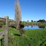 le panneau indiquant la bifurcation depuis l'autoroute, et arrivée au Hobbiton Movie Set à 12h, sous un grand soleil. En roulant, et en s'approchant du lieu, on comprend pourquoi Peter Jackson