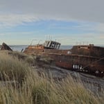 Nous sommes un groupe de huit personnes, dont un couple de français, que nous avions rencontré - tenez vous bien - à Bora Bora, là où nous logions. Même si nous ne leur avions pas beaucoup parlé, c'est quand même trop drôle de se retrouver là aujourd'hui après s'être vu à des milliers de kilomètres il y a un mois. Il fait encore nuit quand nous partons tous vers le nord-est, pour faire un long détour vers la partie la plus étroite du détroit de Magellan, où nous prendrons un bateau un gros quart d'heure pour continuer la route en Terre de feu, rejoindre Porvenir (où nous aurions dû directement arriver depuis Punta Arenas si le ferry avait fonctionné aujourd'hui), et continuer vers le sud, pour être au milieu de cette grande île et voir les manchots rois. Il faut déjà 3 heures pour rejoindre le bateau. Nous avons donc le temps de regarder par la fenêtre le ciel s'éclairer progressivement, faisant rougir le nuage d'altitude au dessus de nous - dont la couche inférieure passe d'un bleu/gris à un rouge vif avant de retrouver sa couleur originelle quand le soleil fait son entrée. Quelle introduction. Nous passons à côté des restes d'un bateau à voile du 17 ième dont seule la silouhette se détache en contre jour. Ensuite, sur des dizaines de kilomètres, nous regardons le sol désert et froid de la Patagonie du Sud défiler. Nous prenons à droite, pour quitter la route goudronnée sur laquelle nous sommes depuis le départ, pour prendre une piste en terre et graviers, nous emmenant jusqu'au navire sur lequel nous allons mettre le mini-bus, pour franchir tout-à-l'heure le détroit de Magellan : la "Ruta del fin del mundo", qui traverse la dernière partie de la Patagonie, jusqu'au bout du continent. Il est 9h. Petit arrêt rapide à la demande de Fred pour photographier le panneau l'indiquant. Le jour s'est levé, mais personne n'est bien réveillé. Le mouvement de la voiture nous berce tous, même si les innombrables trous nous font sauter toutes les trente secondes, d'autant que le conducteur, qui a dû prendre cette route un bon paquet de fois, fonce tout droit, quitte à faire presque chasser le véhicule parfois dans certains tournants. C'est sport, surtout dans ce mini-van pas vraiment 4x4. Après deux heures passées comme cela (c'est long), au milieu de rien, entourés par une steppe aride et verglacée par moments, nous faisons un arrêt près d'une carcasse de bateau, complètement rouillée, échouée depuis un demi-siècle. On se croirait presque sur la mer d'Aral. Puis nous arrivons sur le détroit. Nous attendons une dizaine de minutes que le cargo arrive, en compagnie d'un mouton très calin, qui recherche les carresses à la manière d'un animal de compagnie. Et voilà la bête qui se colle à Audrey sans avoir eu le temps de dire quelque chose. Le bateau arrive, et nous voilà 5km plus tard en Terre de Feu. Le paysage est toujours désertique, désolé, balayé par un vent froid. Nous allons à Porvenir, à 130km de là, dernière grande ville avant la toute dernière, Ushuaïa.