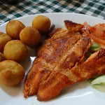 N'allant pas quitter le restaurant, même déçus, nous nous rabattons sur du saumon, et de la viande... tous les deux trop cuits. Archi cuits. Dommage. Par contre, les petites pommes dauphine et leur fromage fondu dedans étaient pas mal du tout... et comme d'habitude, à peine assis, la petite sauce piquante à tartiner sur du pain pour patienter...
