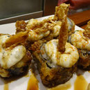 Salde de calamars frits et de gambas et sa salade pimentée avocat/coriandre/menthe (une bombe), taptas, risotto aux fruits de mer flambés au whisky, tagliatelles à l'encre de seiche aux gambas et sa sauce citronée à la coco, coriandre, salade au foie de veau, et une truite fumé au lait de coco, accompagnée de gnocchis et d'une sauce au wasabi et au sésame...