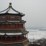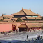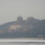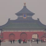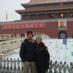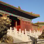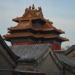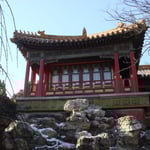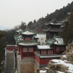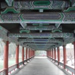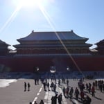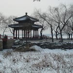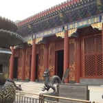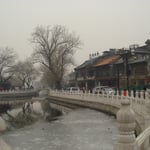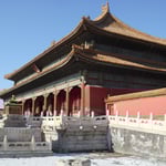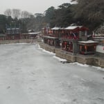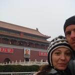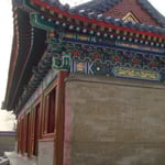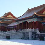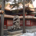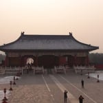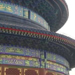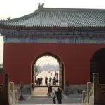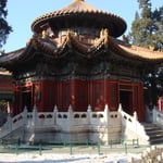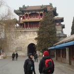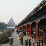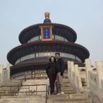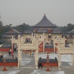Le lendemain, le 27, est la dernière journée complète ici. Nous nous levons, pour aller visiter le Temple du Paradis, au sud de la ville. Le temple est situé dans un parc de 260 hectares, et nous croisons en ce milieu de matinée de nombreux groupes de chinois, la plupart du temps agés, faisant de la gymnastique, s'étirant, dansant ensemble sur une musique asiatique, ou encore jouant à différents jeux. Le moment est un peu incongru, nous ne pensions pas être témoin de la vie de ces personnes en venant ici voir ce temple, construit en 1420, et ses annexes. Les vidéos à venir parleront d'elles mêmes. Le temple en lui même est un bâtiment dans le plus pur style de Confucius, à base ronde (car selon la tradition, le Paradis est rond), d'une trentaine de mètres de haut, et servait à sacrifier des animaux pour que les récoltes soient fructueuses. Nous goûtons nos derniers moments dans cet environnement proprement chinois. Nous croisons un couple de jeunes mariés, se faisant photographier ici. Elle porte une robe rouge caractéristique des mariages chinois. Nous passons sur un autel de marbre blanc, surélevé de quelques mètres, et dont le diamètre en fait neuf. Le nombre 9 revient tout le temps. C'est le nombre impérial. Les nombres impairs ont en effet un sens divin, et 9 est le plus grand parmi ceux à un chiffre (et 1 est un nombre impair également). Il y a par exemple deux séries de 9 marches pour rejoindre le centre de l'autel. Nous visitons enfin d'autres bâtiments, en rapport avec le temple, tout autour. La neige persistante rend le décor aussi joli que les autres jours, avec ces couleurs bleutées, vertes, rouges, et dorées. Il est un peu plus de midi quand nous repartons.