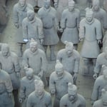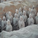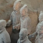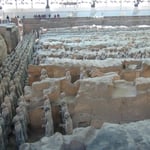 Après avois étudié les différentes options avec nos compères ibériques, et nous être renseignés auprès de la réception, nous concluons qu'il vaut mieux aller voir l'armée en bus local, même si nous avons un changement, plutôt que de prendre deux taxis, ou de passer par le service de la guesthouse (qui comprend un guide, un arrêt shopping, un arrêt boisson...). Nous repartons ainsi vers ce bâtiment administratif, sur la grande place, et prenons notre premier bus. Dedans, rien pour composter. Il faut simplement glisser un billet de 1 yuan dans la petite tirelire. Et tant pis pour vous si vous n'avez pas la monnaie. Nous sommes un peu bruyants, et nos amis en forme. Nous nous installons au premier étage. De retour à la gare, nous cherchons pas mal de temps cet endroit où se trouve le second bus, le 306. Coup de chance, quand nous le trouvons, il s'apprête à partir. Le trajet coûte 7 yuans par personne (presque 1 euro), et prend un peu plus d'une heure. Nous en aurions payé 200 en taxi. Nous prenons une autoroute, et ne quittons jamais les zones urbaines. Nous passons à côté d'une grande centrale thermique, avec deux grandes cheminées, comme dans le Rhône avec nos centrales nucléaires. Nous sommes déposés à une gare routière, juste à côté de l'entrée du parc où se trouve l'armée. Comme souvent, nous prenons un "audioguide", afin d'avoir des commentaires et informations sur ce que nous allons voir, et mieux comprendre tout cela. L'armée en terre cuite, ou Army of Terracotta Warriors, est une des découvertes archéologiques les plus célèbres au monde. Pendant plus de deux millénaires, ces milliers de soldats à taille humaine, enterrés sous terre, ont silencieusement gardé la tombe de celui qui a, pour la première fois, unifié la Chine: l'empereur Qin (à ne pas confondre avec la dynastie Qing, entre le 17 et le 20ième siècle, juste après celle des Ming). Dire qu'à cette époque, Platon n'était décédé que depuis 200 ans! On ne sait toujours pas à ce jour s'il était terrifié par les esprits de ceux qu'il avait vaincus de son vivant, croyant qu'ils l'attendraient dans l'au-delà, ou, comme beaucoup d'archéologues pensent, qu'il espèrait que son règne continue une fois mort, dans l'autre monde. Quoiqu'il en soit, l'occasion nous est donnée de porter un regard sur ce que fût le monde de la Chine ancienne. La découverte de cet ensemble fût fortuite. Incroyable quand même. Un pur hasard. En 1974, des paysans ont creusé un puit et découvert une voute enterrée renfermant tous ces soldats. On imagine ce que les experts ont du ressentir lorsqu'ils ont découvert une, puis deux, puis dix, puis cent, puis mille, et enfin plus de 6000 statues, en formation de bataille, mais aussi des chevaux, au fur et à mesure de la progression des recherches. Aujourd'hui, les guerriers ne tiennent plus leurs armes à la main, car celles-ci étaient en bois, et ont donc pourri avec le temps, tout comme des chariots de guerre eux aussi enterrés, et dont on aperçoit les vestiges. Et comme beaucoup le savent, aucun des fantassins n'est identique. La plupart n'ont pas le même visage, mais c'est parfois un détail sur la robe de guerre, la manière dont elle tombe juste sous le genou, ou les protections sur les épaules, qui diffèrent les unes des autres.