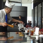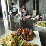ça. Nous montons les 14 étages. Nous arrivons dans une endroit classe, au décor noir, avec plusieurs cuisiniers préparant la viande et des légumes devant des clients attablés face à eux. Bref, un
